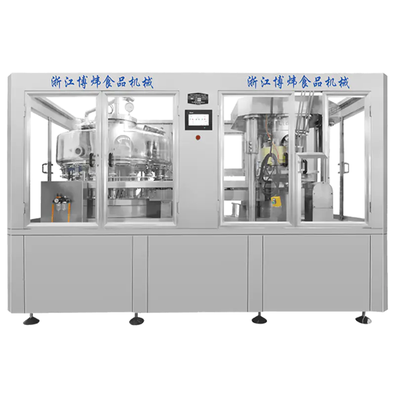本機是在消化吸收國內外(不含汽)易拉罐灌裝封罐機(封口機)的基礎上博煒設計開發的設備。采用常壓灌裝原理,當空罐經撥輪進入升降托罐盤后,灌裝閥和空罐對中,空罐升起并密封,同時自動打開灌裝閥的閥口,當灌裝液面堵住閥的回氣管口時停止灌裝。灌好的罐子經鉤子鏈送到封口機頭,蓋子經送蓋器及壓頭把蓋子送到罐口上,當托罐機構升起時,壓頭壓緊罐口,封口輪先預封再實封,罐子封好后被打蓋機構的打頭推出,然后進入出罐輸送。